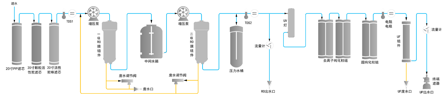 | 一级RO水 | 离子截留率98%-99%(新膜),有机物截留率>99%(MW>200道尔顿)、颗粒和细菌截留率>99% | |||