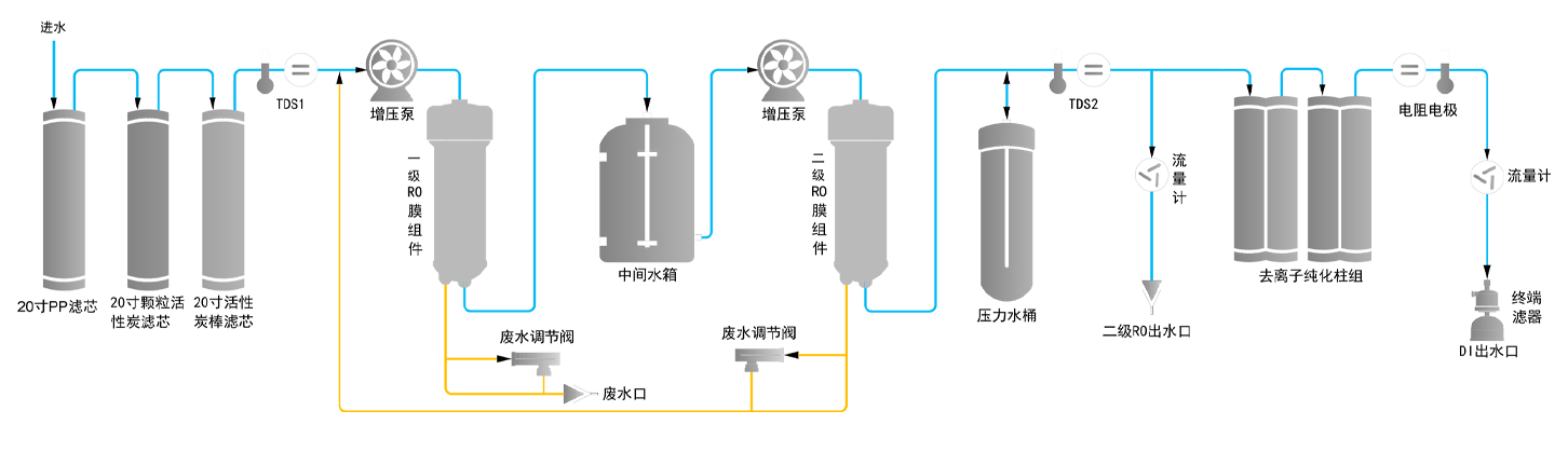 | 二级RO水 | 二级RO水离子截留率>99%(新RO膜),电导率 ≤5μs/cm;有机物/颗粒/细菌截留率>99%; 国标三级水 | |