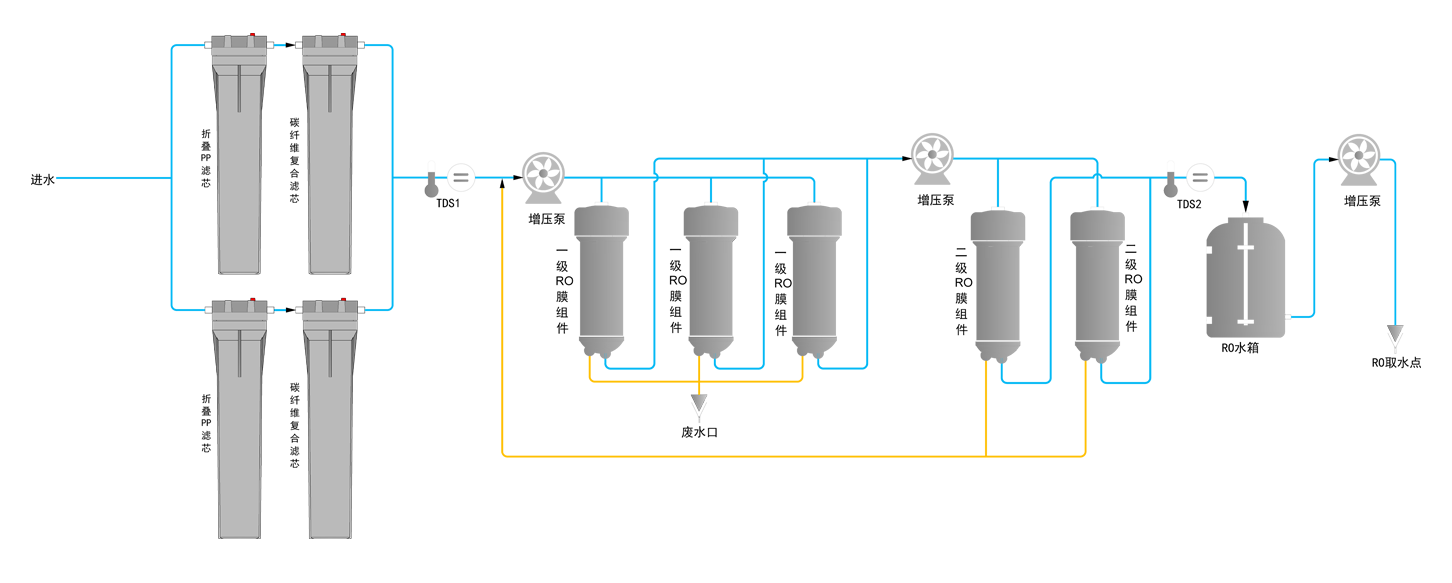 | 二级RO水 | 二级RO水离子截留率>99%(新RO膜),电导率 ≤5μs/cm; 有机物/颗粒/细菌截留率>99% | |||