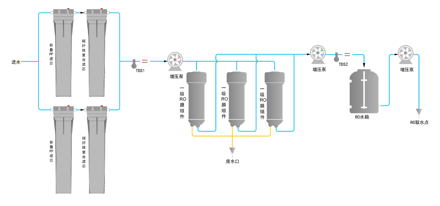 | 一级RO水 | 离子截留率98%-99%(新膜),有机物截留率>99%(MW>200道尔顿)、颗粒和细菌截留率>99% | |||