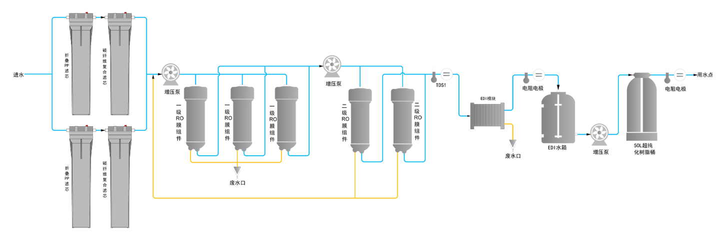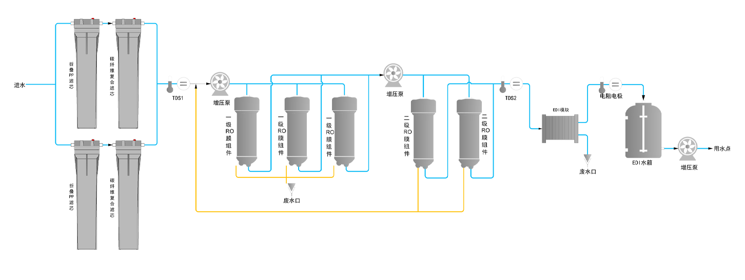 | 二级RO水 | 二级RO水离子截留率>99%(新RO膜),电导率 ≤5μs/cm; 有机物/颗粒/细菌截留率>99% | |