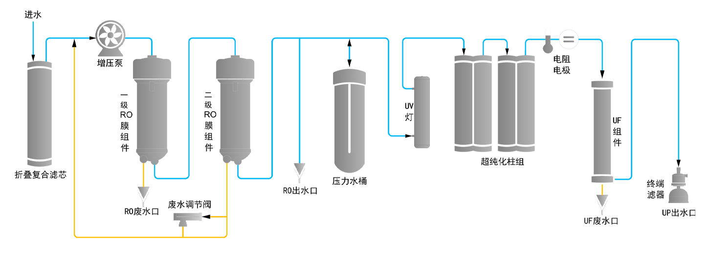| 二级RO水 | 二级RO水离子截留率>99%(新膜),电导率≤5μs/cm;有机物/颗粒/细菌截留率同上; 国标三级水(仅RRO/RS) | |||