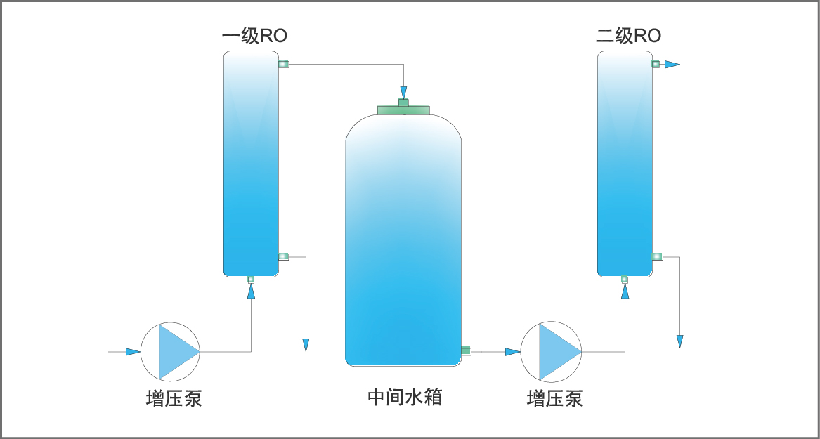 - · 采用双泵双膜及过渡水箱,使系统能耗更低、废水更少,产水质量更稳定.